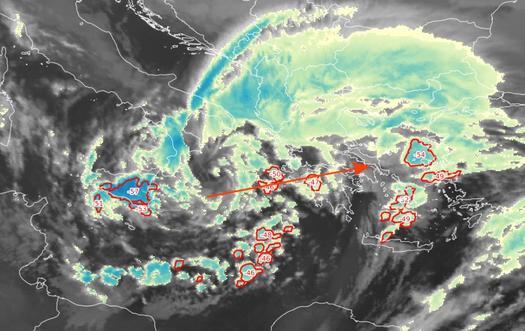 ✅Η ημέρα συνεχίζεται με την ψυχρή μάζα και τον πυρήνα του συστήματος να κινείται ανατολικά βορειοανατολικά.