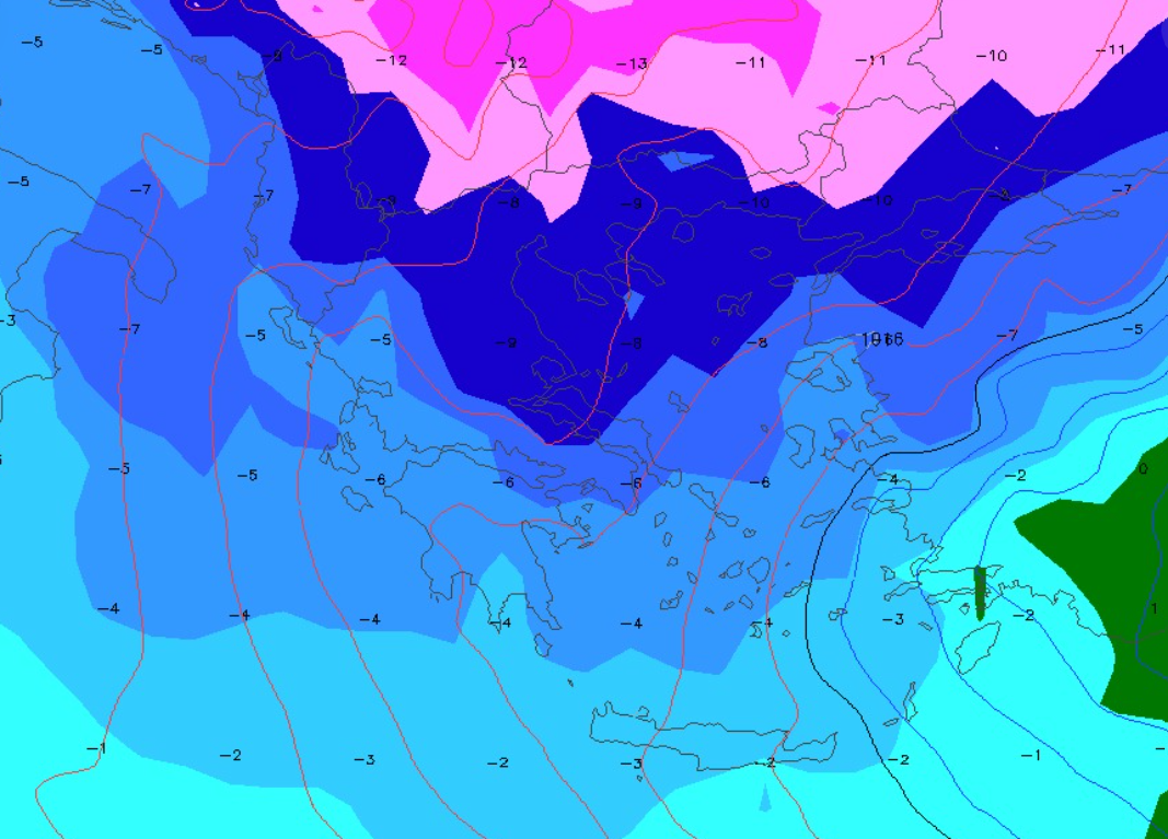 ✅ Συγκεκριμένα, ενώ σε ορισμένα πεδία εμφανίζονται οριακά ή πρόσκαιρα «χειμερινά» χαρακτηριστικά –όπως αρνητικές θερμοκρασίες στα 850 hPa στα βόρεια ή χαμηλές τιμές πάχους 1000–850 hPa– αυτά δεν συνδυάζονται χωρικά και χρονικά με τα υπόλοιπα αναγκαία στοιχεία. Το πάχος 1000–500 hPa, που αποτελεί βασικό δείκτη της ψυχρότητας ολόκληρης της τροπόσφαιρας, παραμένει σε τιμές που δεν υποστηρίζουν εκτεταμένη ψυχρή κατάβαση. Παράλληλα, οι τιμές της θw στα 850 hPa και οι θερμοκρασίες υγρού βολβού κοντά στο έδαφος δεν δείχνουν γενικευμένα αρνητικά πρόσημα, παρά μόνο τοπικά και παροδικά.