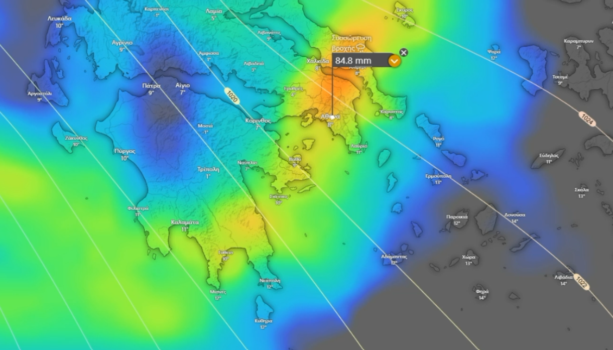 Εδώ εμφανίζεται καθαρά η ταχύτερη έλευση των βροχών. Η ζώνη υετού εξαπλώνεται γρήγορα προς την κεντρική και ανατολική Ελλάδα, με πιο συνεκτικά και εκτεταμένα φαινόμενα. Παράλληλα, κάνουν την εμφάνισή τους σποραδικοί κεραυνοί ενσωματωμένοι μέσα στη γενικευμένη βροχή. Είναι το χρονικό σημείο όπου η ανώτερη δυναμική «κουμπώνει» με την υγρασία και αυξάνει τον κίνδυνο τοπικών ραγδαιοτήτων.