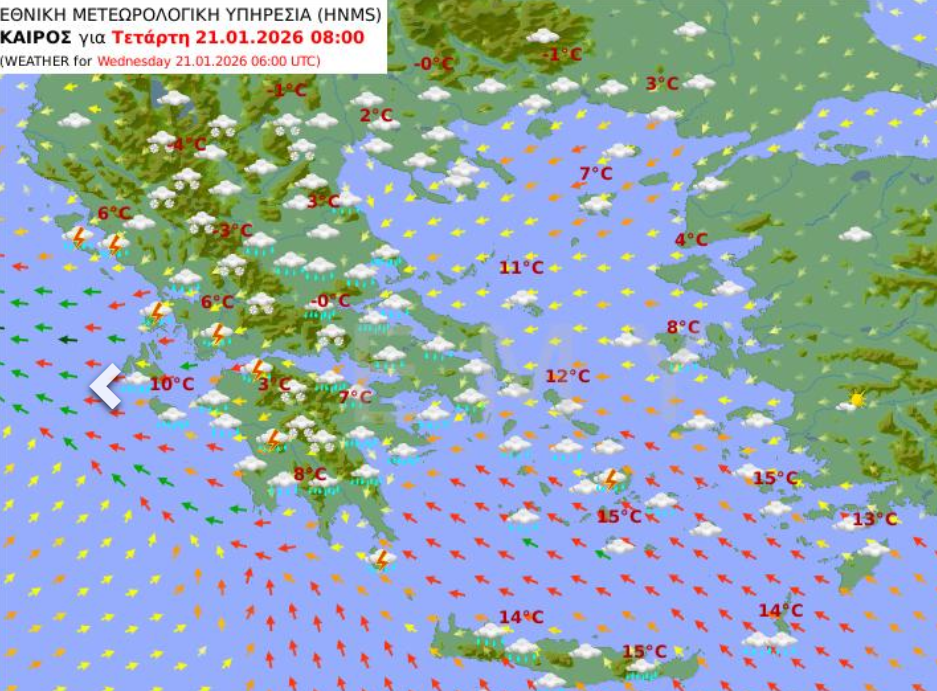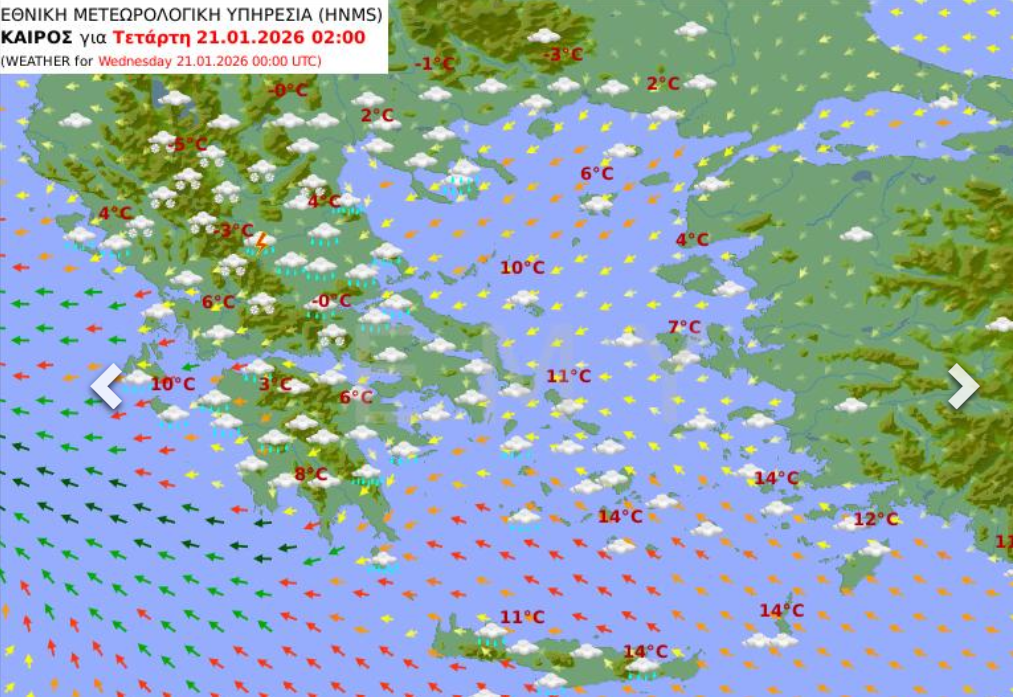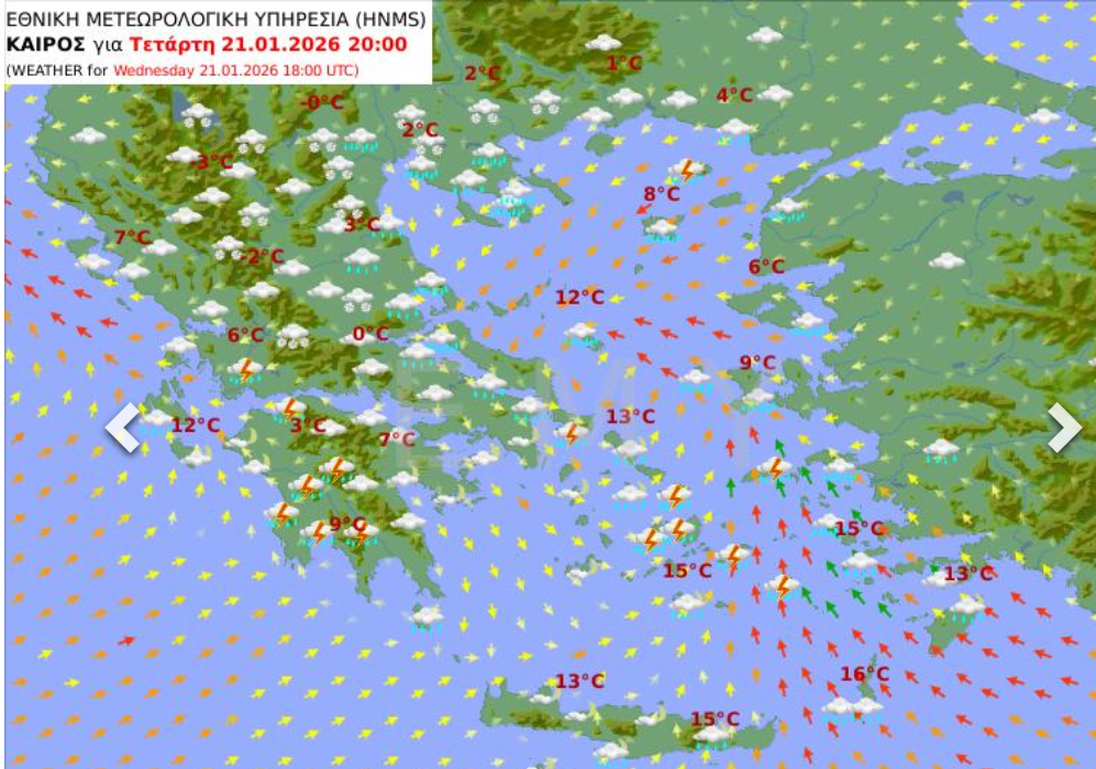 Οι χάρτες της Εθνικής Μετεωρολογικής Υπηρεσίας καταγράφουν πλήρως την κακοκαιρία που αναμένεται στη χώρα μας, Τρίτη και Τετάρτη με πολλές καταιγίδες στα νότια πεδινά και πολλές χιονοπτώσεις στα κεντρικά και βόρεια ορεινά και ημιορεινά.