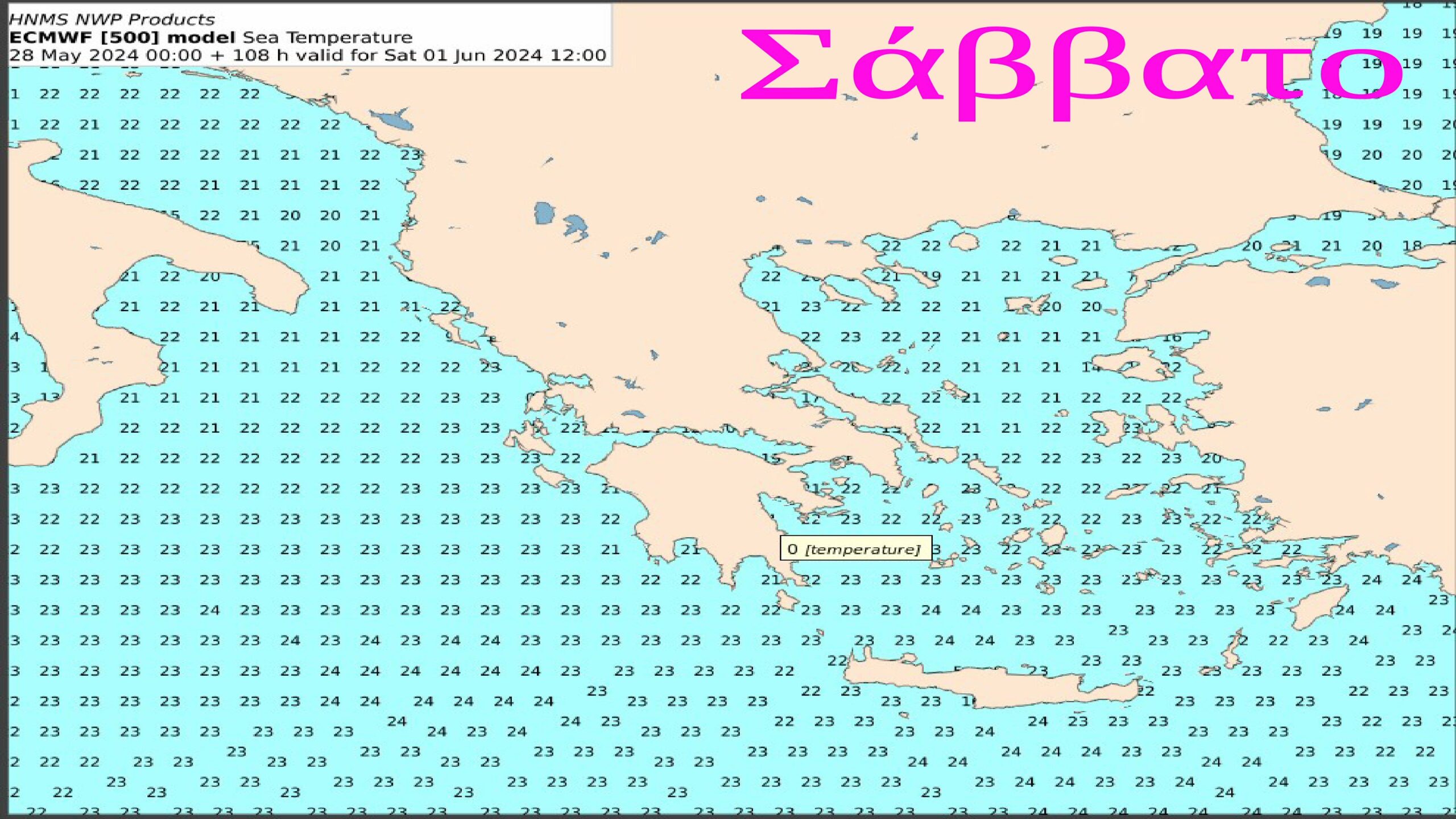 «Μαζί με την άνοδο της θερμοκρασίας του αέρα , ζεσταίνουν και τα νερά στις Ελληνικές θάλασσες το ερχόμενο Σαββατοκύριακο με τιμές πάνω από 20° C . Βέβαια όλοι γνωρίζουμε ότι η ημερήσια και ετήσια μεταβολή της θερμοκρασίας της επιφάνειας της θάλασσας παρουσιάζει εύρος πολύ μικρότερο από εκείνο της θερμοκρασίας της επιφάνειας του εδάφους.
