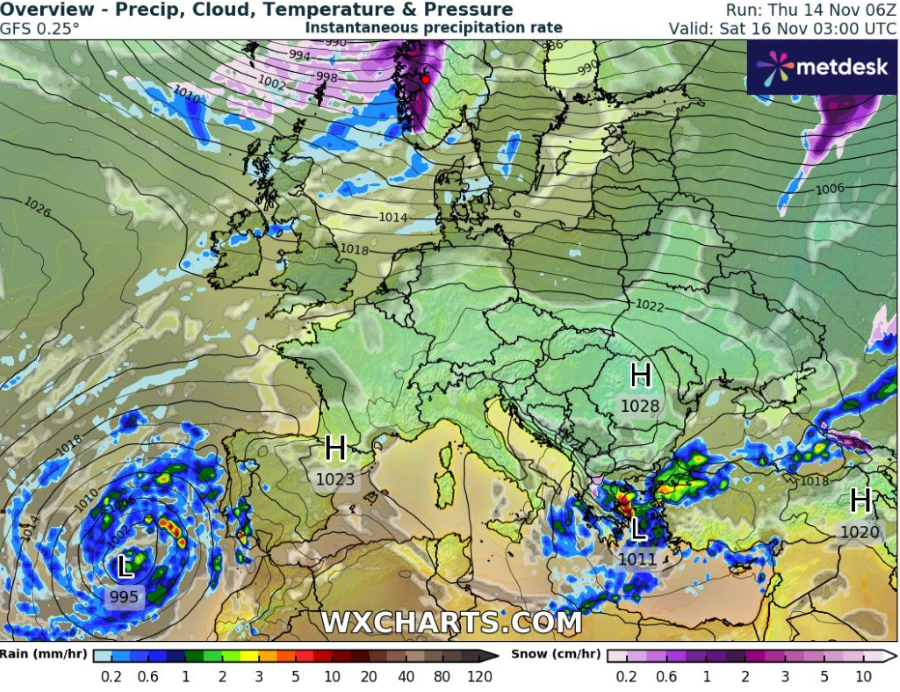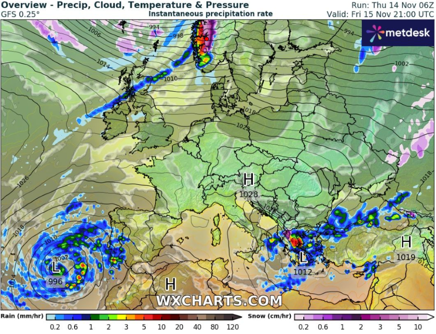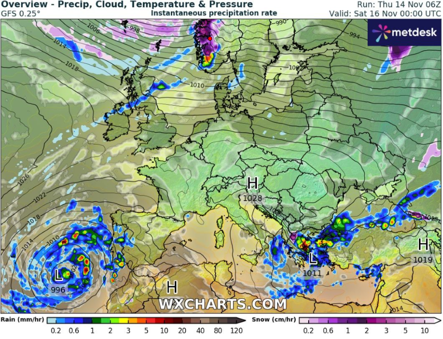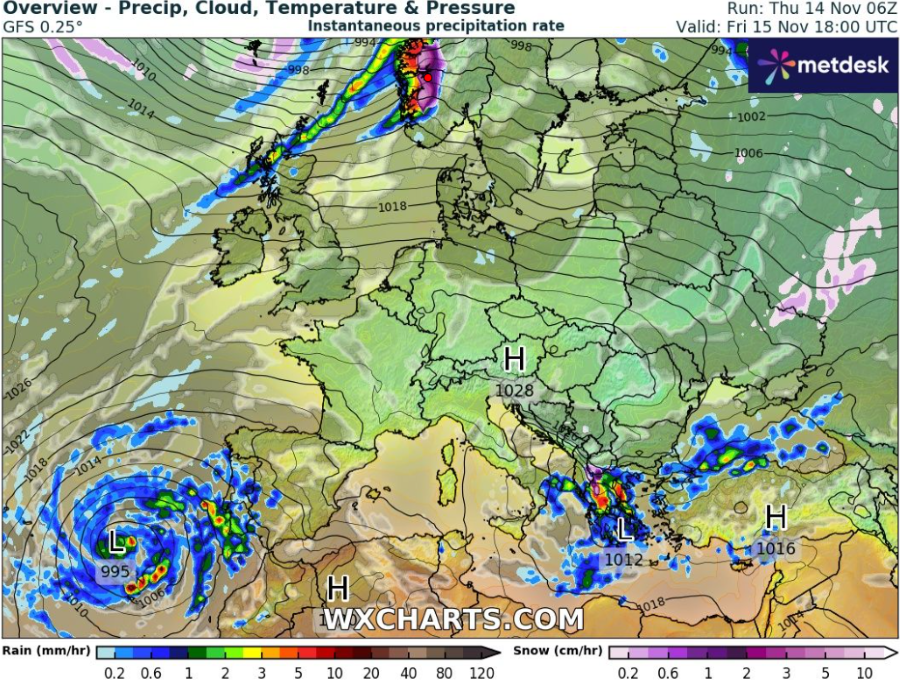 «Καλή σας ημέρα .Έχουμε ήδη αναφέρει ότι από αύριο Παρασκευή ξεκινά ένας νέος γύρος βροχοπτώσεων καθώς ανώτερο χαμηλό (στα 500hPa)το βράδυ της Παρασκευής βρίσκεται στο Ιόνιο , κινούμενο ανατολικά. Το σύστημα αυτό θα επηρεάσει από το βράδυ της Παρασκευής και το Σάββατο τα ανατολικά και νότια και κυρίως τη Θεσσαλία (Αν. Θεσσαλία -Πήλιο ) τις Σποράδες και την Κεντρική και βόρεια Εύβοια. Τα φαινόμενα του Σαββάτου το βράδυ θα περιοριστούν στα ΝΑ».