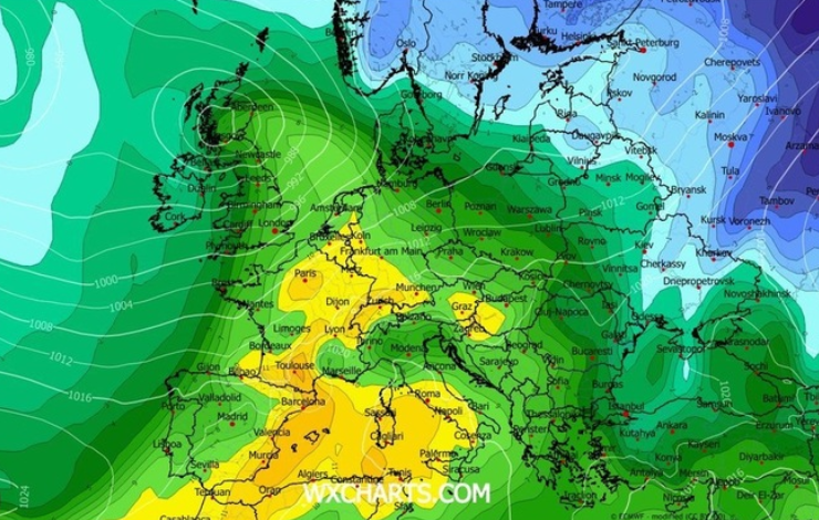 Αντίθετα, στην Ευρώπη επικρατεί μια σταθερή και ασυνήθιστα ήπια ατμοσφαιρική κατάσταση. Οι θερμοκρασίες παραμένουν συνεχώς πάνω από τις μέσες εποχικές τιμές, με ανώτατες αποκλίσεις που μπορεί να φτάσουν ακόμα και +12°C πάνω από τα φυσιολογικά για την εποχή επίπεδα. Οι Άλπεις βλέπουν το μηδενικό ισοθερμικό να φτάνει κοντά στα 4000 μέτρα, γεγονός που περιορίζει σημαντικά την πιθανότητα ψυχρών εισβολών ή χιονοπτώσεων σε χαμηλά υψόμετρα.